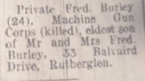 Newspaper transcript – Private Fred. Burley (24), Machine Gun Corps (killed), eldest son of Mr and Mrs Fred. Burley, 33 Balvaird Drive, Rutherglen.