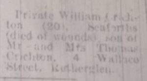 Newspaper transcript – Private William Crichton (20), Seaforth (died of wounds) son of Mr and Mrs Thomas Crichton, 4 Wallace Street, Rutherglen.