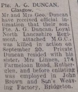 Newspaper transcript – Pte. A. G. Duncan, Glasgow. Mr and Mrs Geo. Duncan have received official intimation that their son, Pte. A. G. Duncan, Loyal North Lancashire Regiment, attached M.G.C., was killed in action on September 20. Private Duncan resided with his sister, Mrs Linnen, 174 Farmeloan Road, Rutherglen, and before enlisting was employed in John Brown and Son’s Weaving Factory, Bridgeton.