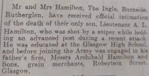 Newspaper transcript – Mr and Mrs Hamilton, The Ingle, Burnside, Rutherglen, have received official intimation of the death of their only son, Lieutenant A.L. Hamilton, who was shot by a sniper while holding an advanced post during a recent attack. He was educated at the Glasgow High School, and before joining the Army was engaged in his father’s firm, Messrs Archibald Hamilton and Sons, grain merchants, Robertson Street, Glasgow.