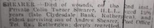 Newspaper transcript – Shearer. – Died of wounds, on the 2nd inst., Private Colin Turner Shearer, H.L.I., aged 191/2 years (late Clydesdale Bank, Rutherglen), and eldest surviving son of Andrew Shearer, Post Office Tel. Ex., Rutherglen; deeply regretted.