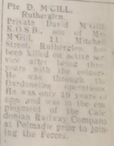 Newspaper transcript – Pte. D. McGill, Rutherglen. Private David McGill, K.O.S.B., son of Mrs McGill, 11 Mitchell Street, Rutherglen, has been killed on active service after being three years with the colours. He was through the Dardenelles operations. He was only 19 years of age and was in the employment of the Caledonian Railway Company at Polmadie prior to joining the Forces.