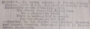 Newspaper transcript – Hudson. – In loving memory of Private George Hudson, 1/7th H.L.I., who died of wounds at the Dardanelles on the 17th July, 1915.