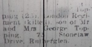 Newspaper transcript – Pte. George Topping (23), London Regiment (killed), son of Mr and Mrs George Topping, 73 Stonelaw Drive, Rutherglen.
