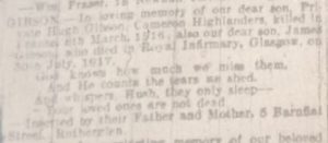 Newspaper transcript – Gibson. – In loving memory of our dear son, Private Hugh Gibson, Cameron Highlanders, killed in France, 8th March 1916, also our dear son James Gibson, who died in Royal Infirmary, Glasgow, 30th July, 1917.