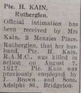 Newspaper transcript – Pte. H. Kain, Rutherglen. Official intimation has been received by Mrs Kain, 2 Menzies Place, Rutherglen, that her husband, Pte. H. Kain, R.A.M.C., was killed in action on August 7, 1917. Pte. Kain was previously employed by J Brown and Sons, Adelphi St., Bridgeton.