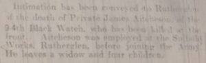 Newspaper transcript – Intimation has been conveyed to Rutherglen of the death of Private James Aitchison, of the 9-4th Black Watch, who has been killed at the front. Aitchison was employed at the Spittal Works, Rutherglen, before joining the Army. He leaves a widow and four children.