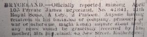 Newspaper transcript – Bryceland. – Officially reported missing, April 10, Private James Bryceland, No. 41841, 11th Royal Scots, A Coy., 2 Platoon. anyone having relatives in his battalion or company, prisoners of war or otherwise, might kindly inquire about him; any news would be gratefully received by his mother, Mrs Bryceland, 45 New Street, Rutherglen.