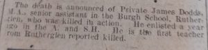 Newspaper transcript – The death is announced of Private James Dodds, M.A., senior assistant in the Burgh School, Rutherglen, who was killed in action. He enlisted a year ago in the A. and S.H. He is the first teacher from Rutherglen reported killed.