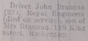 Newspaper transcript – Driver John Brannan (27), Royal Engineers (died on service), son of Mrs Brannan, 119 King Street, Rutherglen