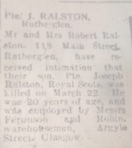 Newspaper transcript – Pte J. Ralston, Rutherglen. Mr and Mrs Robert Ralston, 118 Main Street, Rutherglen, have received intimation that their son, Pte. Joseph Ralston, Royal Scots, was killed on March 22. He was 20 years of age, and was employed by Messrs Ferguson and Robin, warehousemen, Argyle Street, Glasgow.
