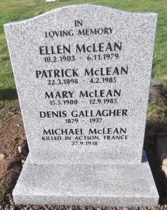 Headstone transcript – Michael McLean killed in action, France, 27.9.1918.