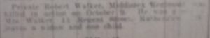 Newspaper transcript – Private Robert Walker, Middlesex Regiment was killed in action on October 9. He was a ? Mrs Walker, 11 Regent Street, Rutherglen. He leaves a widow and one child.
