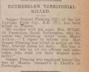 Newspaper transcript – Rutherglen Territorial Killed. Sapper Samuel Fleming (23), of the 1st Lowland Field Coy., R.E. (T.), has been killed in France.