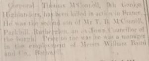 Newspaper transcript – Corporal Thomas McConnell, 9th Gordon Highlanders, has been killed in action in France. He was the second son of Mr T. B. McConnell, Parkill, Rutherglen, an ex Town Councillor of the burgh. Prior to the war he was a manager in the employment of Messrs William Baird and Co., Bothwell.