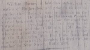 Newspaper transcript – William Barnes, a first-class stoker, was a native of Rutherglen, and prior to his signing on for the Bayano, was a fireman on the Cassandra. He joined the Bayano on Wednesday of last week, the day before the vessel was torpedoed. Previously he had been on Cameronia and the California. Mr Barnes who was about 30 years of age, was a member of the Rutherglen Blue Bell Flute Band, and was well known in Rutherglen. He lived with his mother in New Street, Rutherglen.
