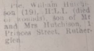 Newspaper transcript –Pte. William Hutchison (19), H.L.I. (died of wounds), son of Mr and Mrs Hutchison, 1 Princes Street, Rutherglen.