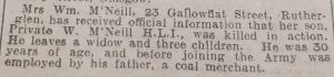 Newspaper transcript – Mrs Wm. McNeil, 23 Gallowflat Street, Rutherglen, has received official information that her son, Private W. McNeil, H.L.I., was killed in action. He leaves a widow and three children. He was 30 years of age, and before joining the Army was employed by his father, a coal merchant.