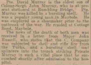 Newspaper transcript – Pte. David Murray is the eldest son of Colour-Sergt. John Murray, who is at present stationed at Rumbling Bridge. Pte. Murray was killed by a bursting shell. He was a popular young man in Maybole. He was employed as a shoemaker prior to the outbreak of war. He resided at Cottage Road, Maybole.